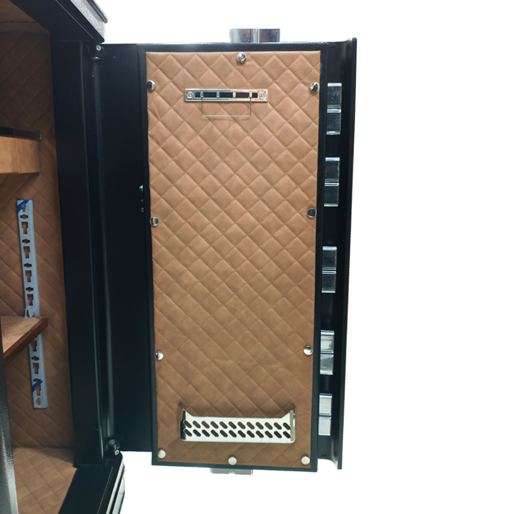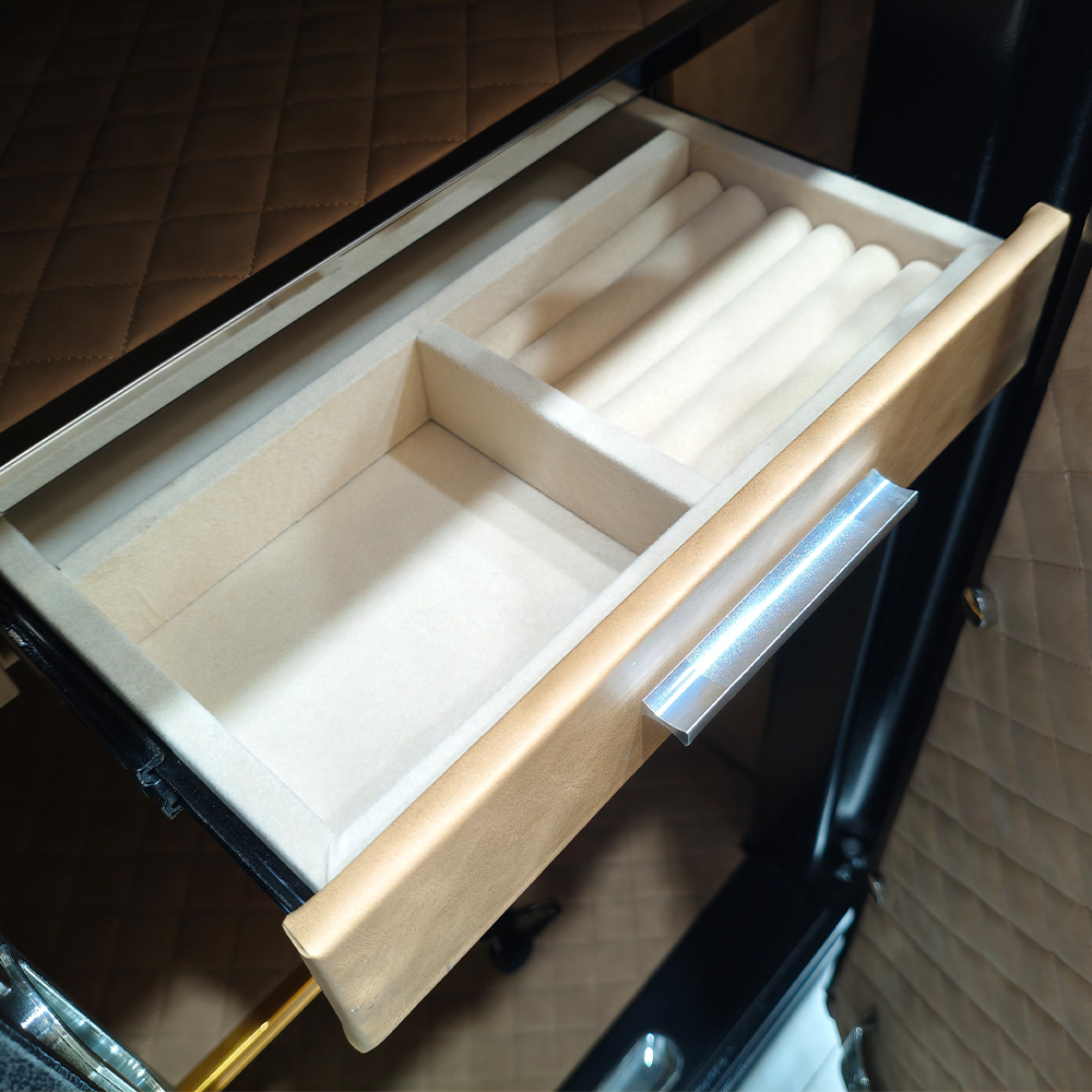 Inside, the locker features a premium leather interior designed to protect delicate valuables. It includes a dedicated jewelry drawer, a hidden chamber for confidential storage, and an adjustable shelf for flexible organization. The smooth black exterior finish gives the locker a modern, elegant appearance suitable for both residential and professional environments.