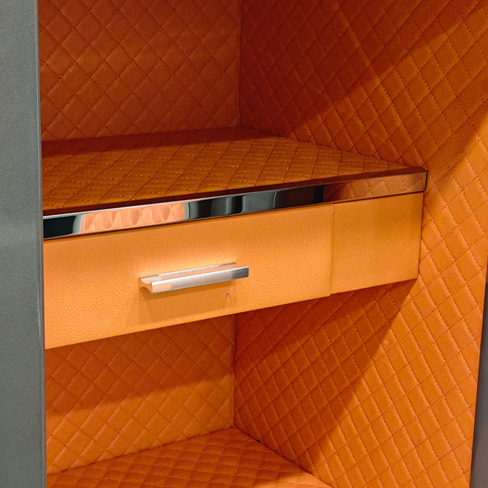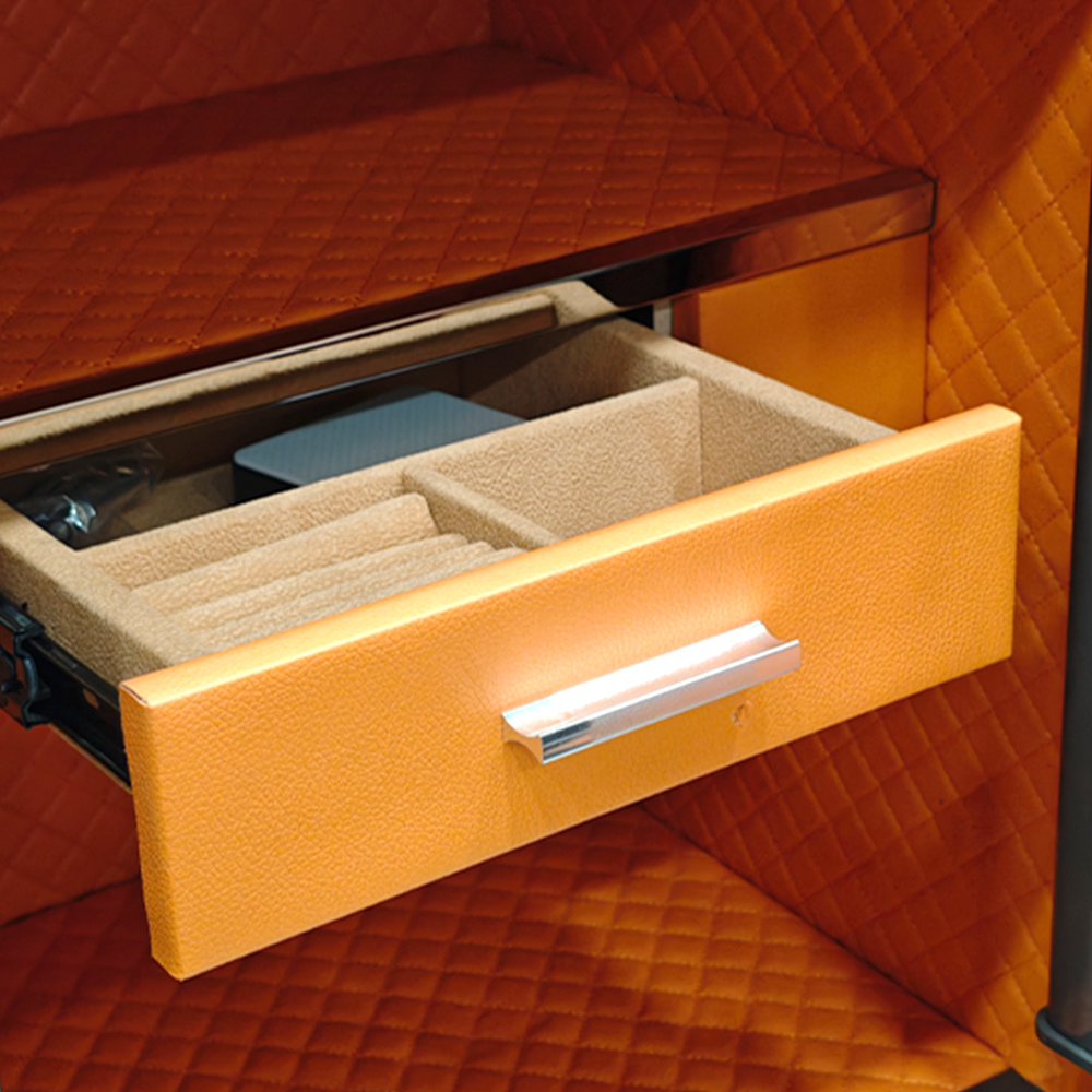 Its dark chocolate exterior finish paired with a bright orange leather interior creates a luxurious and professional appearance. Inside, the locker features a removable jewelry drawer along with a well-structured shelf, allowing safe and organized storage of jewelry, cash, documents, valuables, and electronic items.